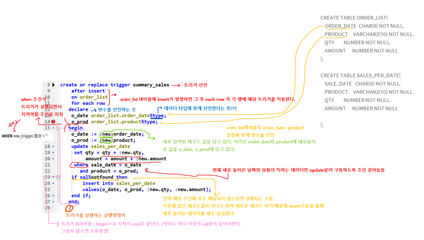 - 제약조건과 함께 데이터 무결성을 지키는 하나의 방법으로서 특정 이벤트에 대해서 연속적으로 자동 동작하는 특수한 형태의 저장 프로시저(procedure)