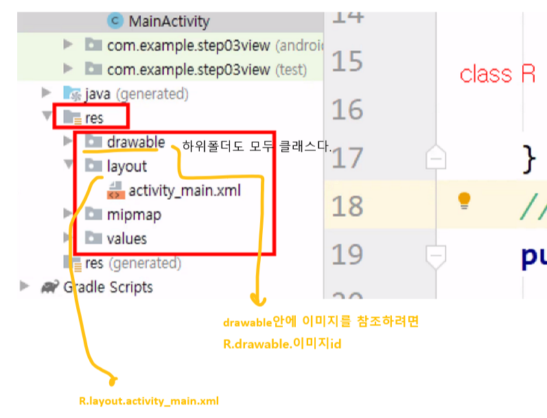 그래서 레이아웃 상의 ui 자원들의 id참조할때 R 클래스 내부에 id정적필드를 가지고 있기 때문에