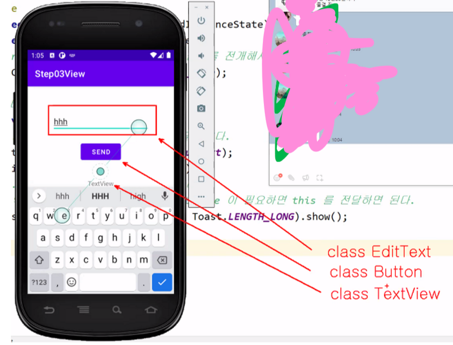 findViewById(R.id.아이디); 하면 xml에 만들어진 ui객체가 내부적으로 생성되고