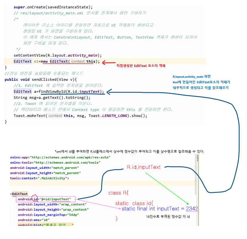 그래서 레이아웃 상의 ui 자원들의 id참조할때 R 클래스 내부에 id정적필드를 가지고 있기 때문에