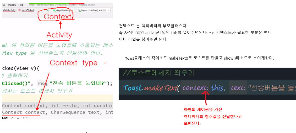 토스트메세지 나 AlertDialog 출력할때 전달되는 Context는 Activity Context이고 이때 this를 넣어주는 이유도