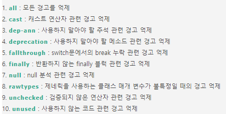 컴파일러가 일반적으로 경고하는 내용 중 "이건 하지마" 하고 제외시킬 때 쓰는 어노테이션 으로