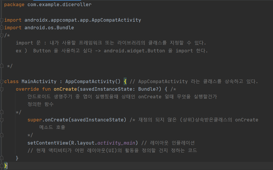 프로젝트를 처음 생성하면 생기는 MainActivity는 최상위 수준 또는 앱을 실행하면 보게되는 첫번째 활동을 정의한다.