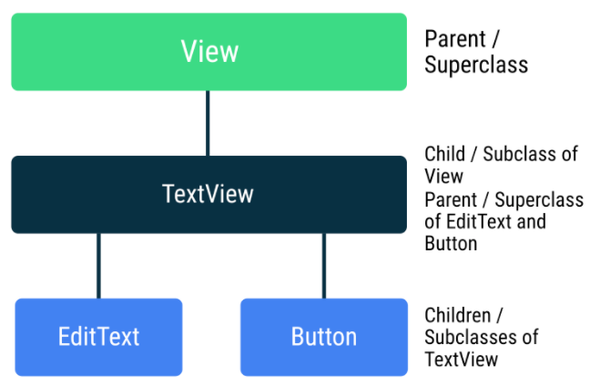 화면에 직사각형을 나타내고 그리기와 이벤트 처리를 담당하는 View클래스는 TextView 클래스를 자식클래스로 두고있다. 즉 TextView 클래스는 View클래스의 모든 기능과 속성을 상속받고 사용자에게 텍스트를 표시하는 특정 로직을 추가한다.