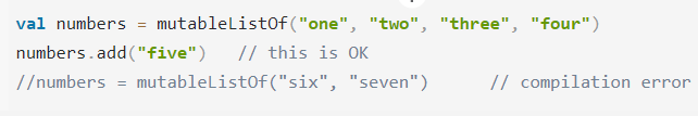 어차피 참조된 번지수는 같기 때문이다. 그러나 초기화된 val에 mutableList를 메소드로 해서 새로 참조시키는건 컴플리에이션 에러가 난다.