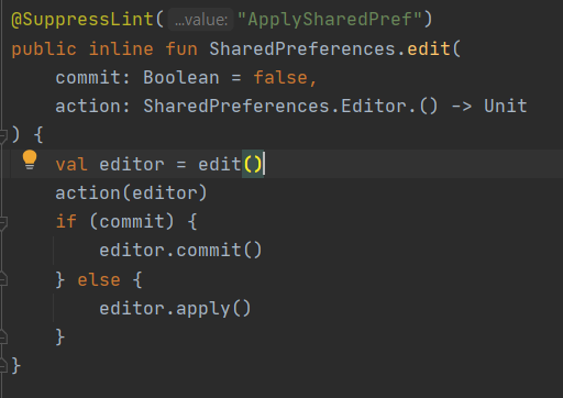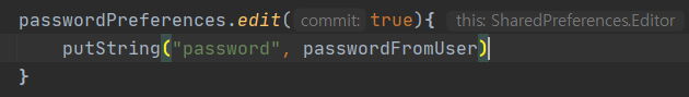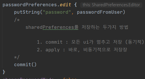 코틀린에서는 edit{} 스코프함수를 지원해서 그안에서 간단하게 SharedPreferences를 사용할 수 있다.