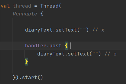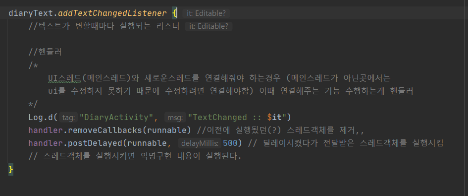 그 다음 diaryText에 새로운 텍스트가 입력될때마다 위에서 정의해준 스레드 객체를 실행시켜주는데 이때