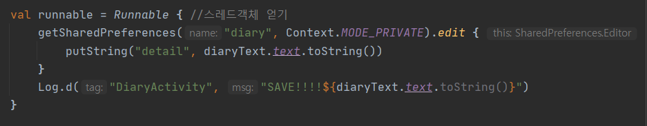 그러곤 새로운 스레드 객체를 얻고 runnable을 정의해준다. 해당 스레드는 run됬을시 아래와 같이 "diary" 라는 SharedPreferences에 "detail"이라는 키값으로 diaryText라는 Textview의 내용을 저장한다.
