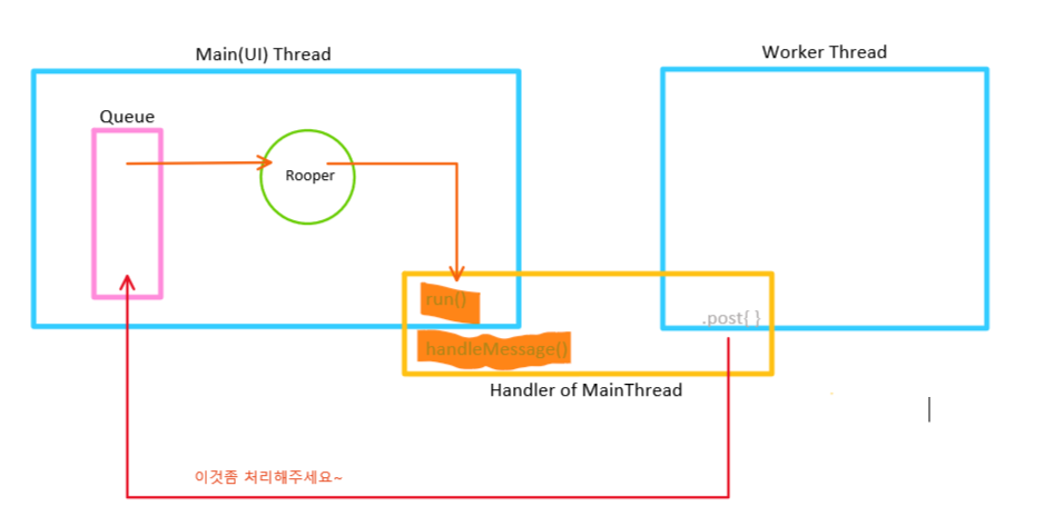 차례가되면 메인스레드의 루퍼가 이를 꺼내어 다시 메인스레드의 핸들러가 내부적으로 run()을 통해 작업을 처리할것이다.