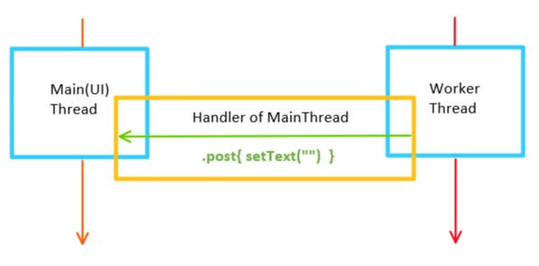 그런데 워커스레드에서 네트워킹 작업을 하고 그 결과를 ui에 적용할때와 같이 메인스레드가 아닌 스레드에서 ui작업을 하게되는 경우 워커스레드에서 ui관련 작업 코드를 입력하면 당연히 오류가 나기때문에 반드시 핸들러를 이용해야한다.