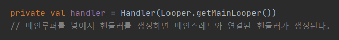 먼저 메인스레드에 핸들러를 생성하도록 한다. 이때 파라미터로 메인루퍼를 주면 메인스레드의 핸들러 객체가 생성된다.