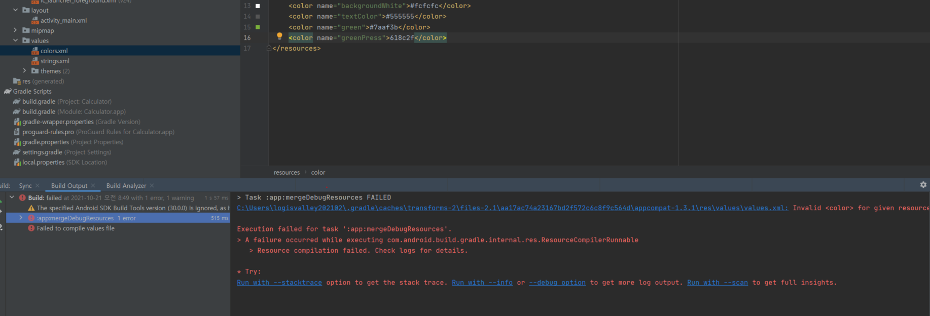 유효하지 않은 값을 <color>에 줘서 그렇다고 하는데 보면 greenPress에는 #을 생략했고